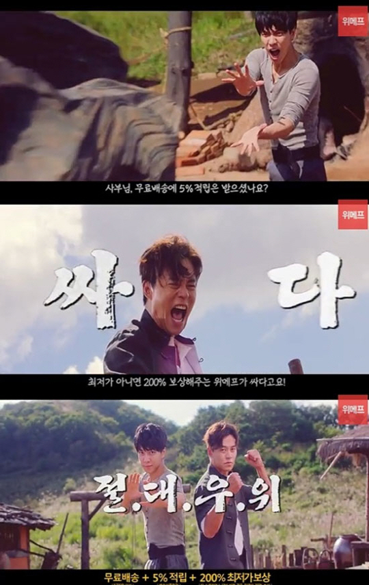 공개된 영상은 쿵푸 편으로 이서진, 이승기는 한 쇼핑몰을 보고 "비싸다"고 이야기 하는 스승 변희봉에게 위메프의 적립과 최저가 보상, 무료배송 등을 설명한다.