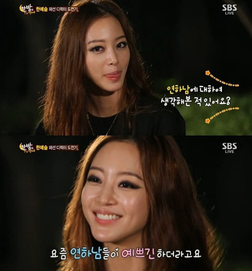한예슬은 2일 오후 방송된 SBS '한밤의 TV연예'에서 "연하남에 대해서 생각해본 적이 있냐"는 질문에 "요즘 연하남들이 예쁘긴 하더라"고 답했다.