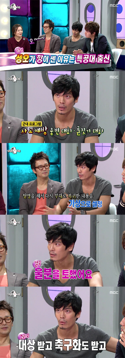 이날 김성오는 "특공대 시절 헬기 레펠을 잘해서가 아니라 웅변으로 표창을 받았냐"는 질문에 "군대에 있으면 할 수 있는 게 정말 많다. 사고예방 웅변대회에 참가했다"고 답했다.