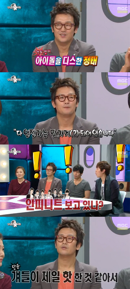 이날 MC들은 "김정태가 겁도 없이 아이돌을 디스했다. '여러분이 잘못 알고 계시는데 지금 꽃미남 아이돌들도 다 언젠가는 맛 가게 되어있다. 인피니트 보고 있나'라는 말을 한 적이 있다"고 운을 띄웠다.