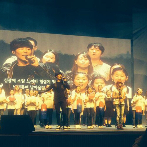 사진에는 카이와 효린이 경축식 행사 사전 리허설에서 어린이 합창단과 함께 호흡을 맞추고 있는 모습이 담겨 있다.