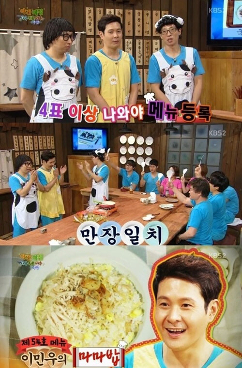 이민우의 '마마밥'을 맛 본 출연진들은 "고슬고슬한 닭죽 먹는 느낌이다" "알리오 올리오에 밥을 넣고 만든 것 같다" "건강한 느낌이다" 등의 호평을 했다.