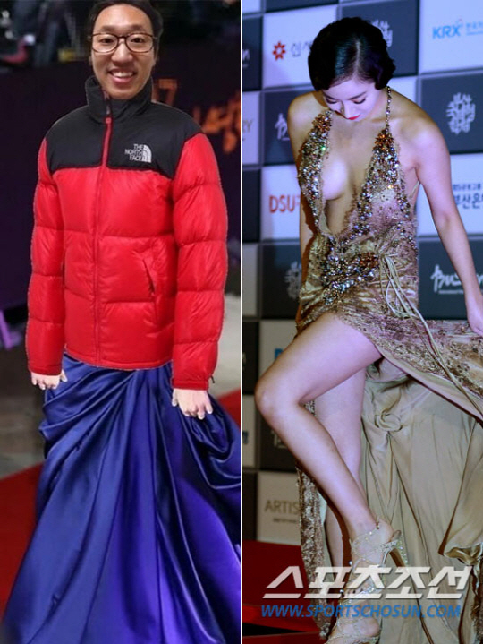 공개한 사진에는 레드카펫 위 드레스를 입은 여배우의 사진에 자신의 얼굴과 상의에 패딩 점퍼를 입은 합성된 모습이 담겨있다.