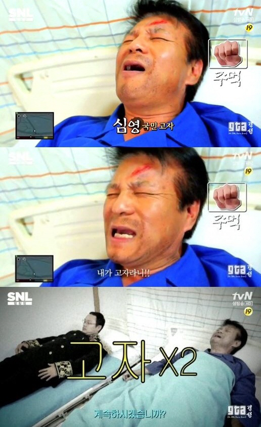 이날 'GTA 경성'에서 김민교는 일제시대를 배경으로 펼쳐진 게임 속에서 이완용으로 분해 거지왕 김춘삼 패거리와 싸우던 중 중요부위(?)에 치명적인 부상을 입고 쓰러져 병원으로 실려 갔다.