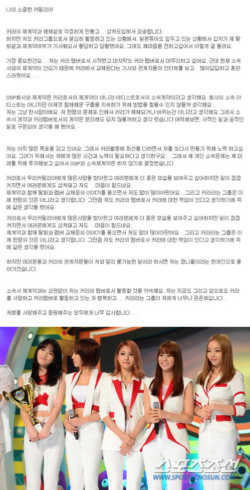 니콜은 "카라의 재계약과 해체설로 걱정하게 만들고 상처도 입혀서 죄송합니다. 하지만 저도 카라로서 열심히 활동하고 있는 상황에서, 일본 투어도 앞두고 있는 상황에서 갑자기 제 탈퇴설과 재계약 여부가 기사화돼서 황당하고 당황했어요"라고 말문을 열었다.