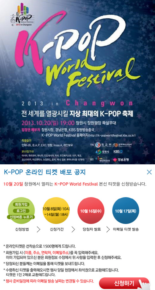 8일 케이팝 월드 페스티벌 측은 공식 홈페이지를 통해 창원시는 8일 오전 10시부터 14일 오후 6시까지 '2013 창원 케이팝 월드 페스티벌' 본선 관람권 신청을 받는다고 밝혔다.