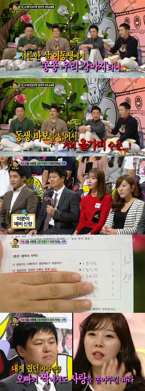 또한 '집착 오빠'는 동생과 동생의 예비신랑과 혼전 계약서까지 작성했다. 이날 공개된 혼전 계약서에는 '쫑쫑이는 오빠 거다. 결혼해도 영원히' ,'쫑쫑이 볼에는 뽀뽀하지 마라', '오빠는 언제든지 쫑쫑이를 데리고 놀러 갈 수 있다', '결혼하면 당연히 오빠도 함께 산다'등의 조항이 담겨 있어 경악게 했다.