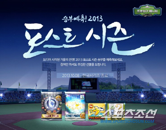 8일부터 포스트 시즌 경기 결과를 예측하고 다양한 보상의 혜택이 주어지는 '2013 승부예측 포스트시즌' 이벤트를 여는 것. 준플레이오프부터 시작해 한국 시리즈가 종료되는 날까지 실시하는 이번 이벤트는 경기의 승리팀을 맞히면 3000포인트를 지급하고, 선택한 팀이 패할 경우 100포인트를 제공한다. 이어서 해당 팀의 경기 내용을 적중해 맞히면 추가로 포인트를 획득할 수 있다.
