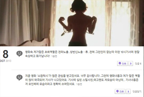 이어 그녀는 "영화속 제가 맡은 초희 역할은 전라노출..상반신노출…휴..전혀 그런신이 없는데 이런 낚시기사에 정말 속상하고 화가 납니다"라고 오해받고 있는 상황에 대해 억울함을 전했다.