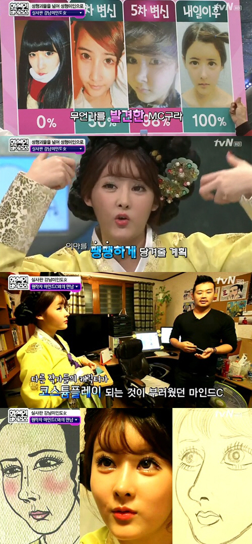 고 1 때부터 성형수술을 시작한 박 씨는 "고치기 전 쌍꺼풀이 아예 없던 눈이다. 매일 화장을 해야 하니깐 수술을 했다. 2차 변신은 고3 때이고 광대뼈를 깎았다. 이후 트렌드에 맞춰 반버선 코를 했다"고 밝혔다. 눈 밑 애교살, 콧대, 이마 지방 흡입, 가슴 수술 등 무려 28군데를 수술한 박 씨는 "아직 '강남미인도' 속의 여자보다는 조금 부족한 것 같다"며 만족하지 못한 모습을 보였다.