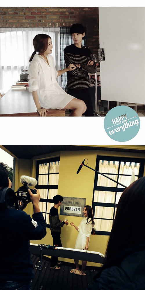 정준영의 데뷔 미니 앨범 타이틀곡 '이별 10분 전' 뮤직비디오 촬영 현장에서 찍은 이 사진에는 밝은 분위기 속에 촬영에 한창인 정유미와 정준영의 다정한 모습이 담겨 있다.