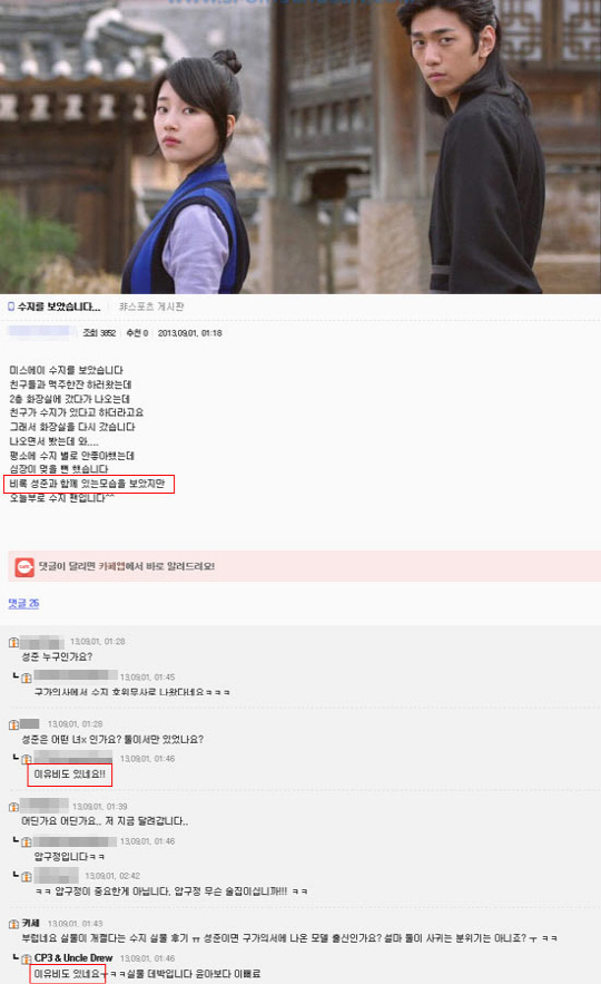 이를 뒷받침 하듯 최근 한 온라인 게시판에는 '9월 수지 목격담'이 게재되어 있다. 게시된 글에는 "압구정에 친구들과 맥주 한잔 하러 왔다가 수지를 봤다. 비록 성준과 함께 있는 모습을 보았지만"이라는 글이 쓰여 있다.