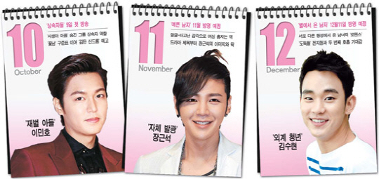 한동안 안방 나들이가 뜸했던 20대 톱배우 3인방이 돌아온다. 10월엔 이민호, 11월엔 장근석, 12월엔 김수현이 신작 드라마를 선보인다. 국내 시청자들은 물론이고 해외 팬들도 술렁이게 할 반가운 소식이다. 그러나 방송 시기가 서로 조금씩 맞물리게 된 세 배우에겐 자존심이 걸린 치열한 경쟁이 될 듯하다.