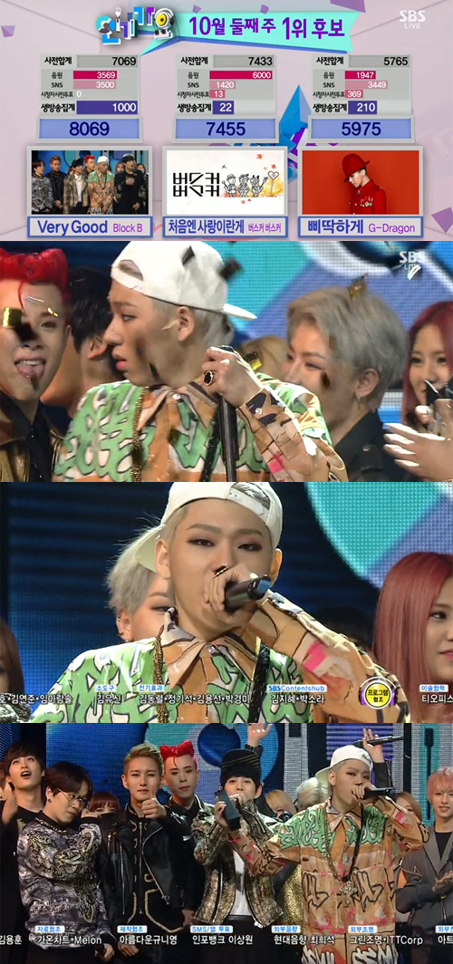 이날 1위 후보에는 블락비 '베리 굿', 버스커버스커 '처음엔 사랑이란 게', 지드래곤 '삐딱하게'가 나란히 올랐다.
