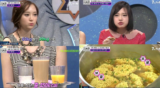 액체만 섭취하는 식욕제로녀는 "비타민이 필요할 땐 오렌지 주스를 먹는다. 크래커 2조각은 탄수화물 보충용"이라고 했다. 식욕제로녀 하루 식단은 권장량 2,000칼로리에 비해 총 450칼로리밖에 되지 않았다.