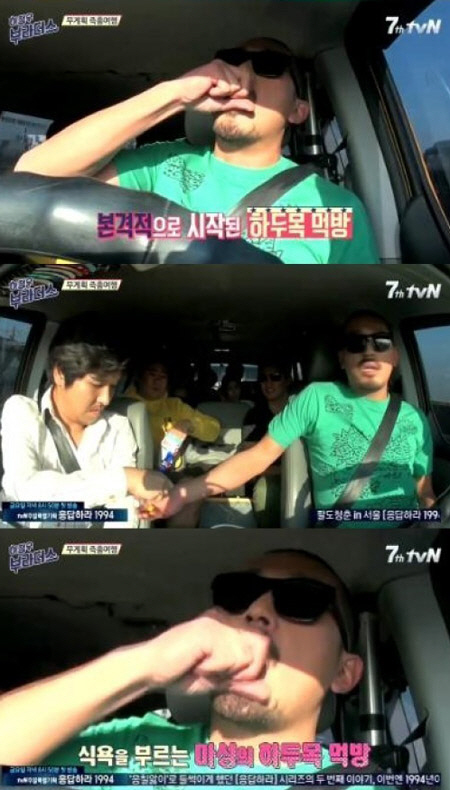 이날 하정우는 직접 운전을 하며 정경호가 있는 일산으로 향하던 중 "오징어 땅콩 맛의 과자 딱 두 알만 줘, 그럼 일산까지 버틸 수 있어"라며 먹방의 시동을 걸었다.