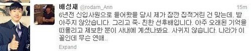 배성재 아나운서는 16일 자신의 트위터에 "6년 전 신입사원으로 들어왔을 당시 제가 잠깐 집적거린 건 맞는데, (박선영 아나운서가) 받아주지 않았습니다"라며 "그리고 쭉 친한 선후배(사이)입니다"라고 박선영 아나운서와의 관계를 밝혔다.