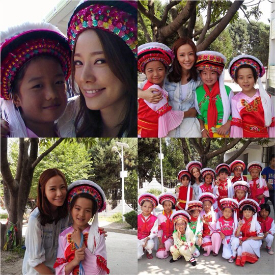이날 게재된 사진 속에는 손태영이 중국의 소수민족의 전통 복장을 한 아이들과 함께 인증샷을 찍고 있는 모습이다.