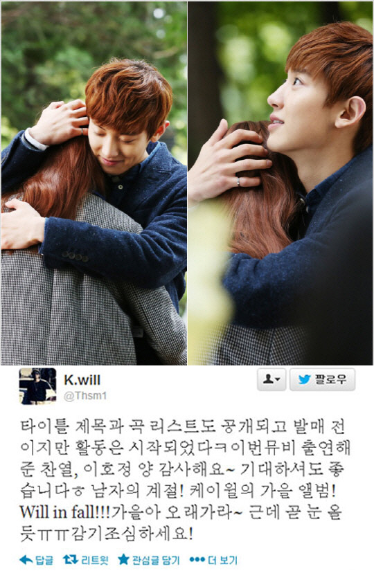 이어 그는 "남자의 계절! 케이윌의 가을 앨범! Will in fall! 가을아 오래가라~ 근데 곧 눈 올 듯. 감기 조심하세요!"라고 덧붙였다.