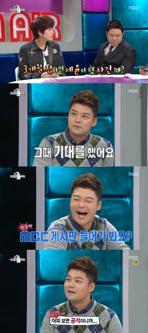 이에 MC규현은 전현무를 향해 "3개월 전이면 유세윤형의 사건 때 였냐"고 묻자, 그는 "그때 기대를 했었다"며 유세윤의 빈자리를 꿰차려 했던 사실을 고백했다.이어 전현무는 "워낙 좋아하는 프로그램이고 자리가 공석이라 그렇게 생각을 했다. 한번 MBC 게시판을 들어가 봤는데 내 이야기가 있더라"며 "'전현무가 제격 아니냐'는 말이 있어서 내심 기대를 하고 있었다. 그런데 전화 한 통 안 왔다"고 말해 현장을 폭소케 했다.