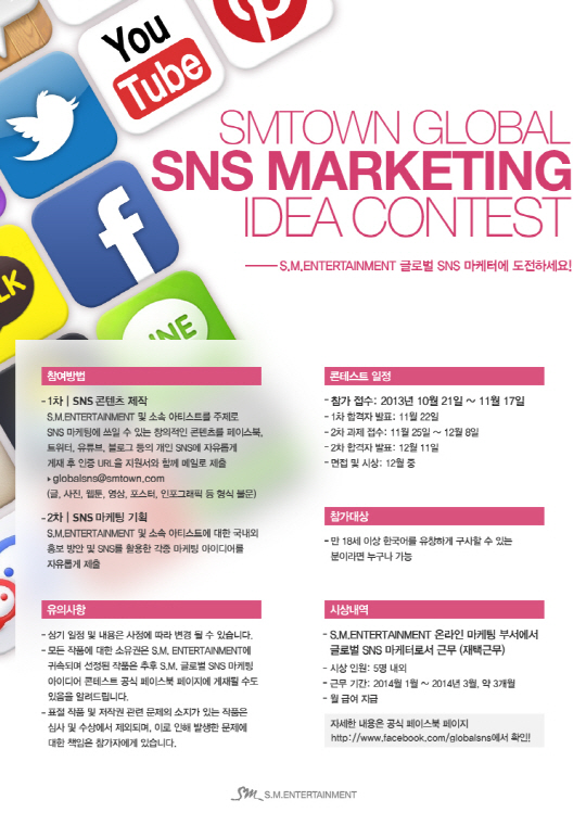 SM은 SNS마케팅에 활용할 수 있는 다양하고 개성 넘치는 아이디어 발굴을 위해 전세계 팬들을 대상으로 콘테스트를 기획, 다양한 아이디어를 가진 글로벌 팬들의 뜨거운 반응이 기대된다.