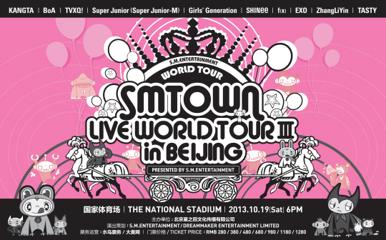 'SMTOWN LIVE WORLD TOUR III in BEIJING'은 오는 19일 중국 베이징올림픽주경기장(Bird Nest)에서 약 7만명 규모로 화려하게 개최되며, 강타, 보아, 동방신기, 슈퍼주니어, 소녀시대, 샤이니, 에프엑스, 엑소, 장리인, 테이스티 등 총 10팀이 참석, 다채롭고 완성도 높은 무대로 중국 음악 팬들을 매료시킬 전망이다.