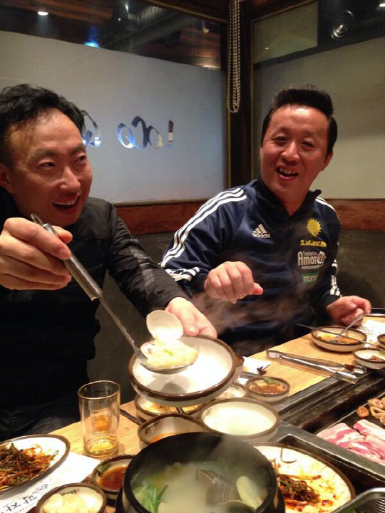 사진에는 박명수와 정준하가 나란히 앉아 미소를 짓고 있는 모습이 담겨 있다. 두 사람 모두 뒤풀이 자리에서 술을 마신 듯 다소 붉어진 얼굴로 화기애애한 분위기가 연출해 눈길을 끈다.