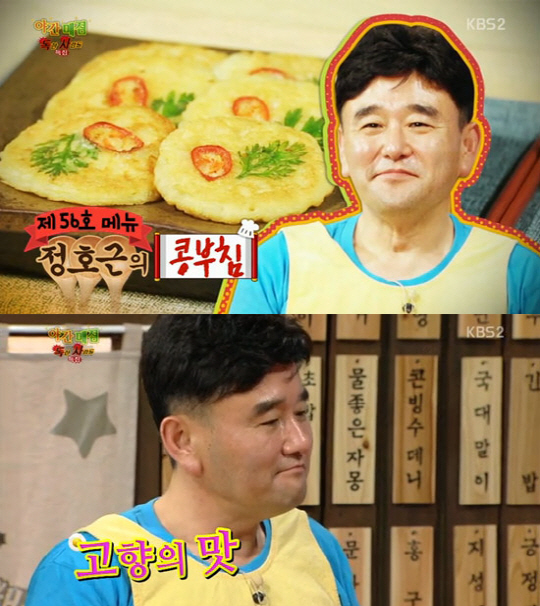 정호근은 "직접 재료를 내가 다 준비 해왔다. 콩을 5시간 이상 불려 줘야 한다"며 "부인이 부쳐서 냉장고에 넣으면 나는 전자랜지에 데워서 먹는다"고 말문을 열었다.