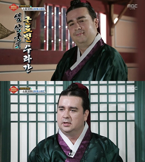 이날 곱게 땋은 가발과 한복을 차려입은 샘 해밍턴은 인자한 미소의 상궁으로 변신했다. 그는 "'대장금'을 사랑하는 샘 상궁이라 하오"라며 자신을 소개했지만, 계속되는 사극 말투에 "이 말투 너무 힘들다"며 고충을 드러내 웃음을 자아냈다.