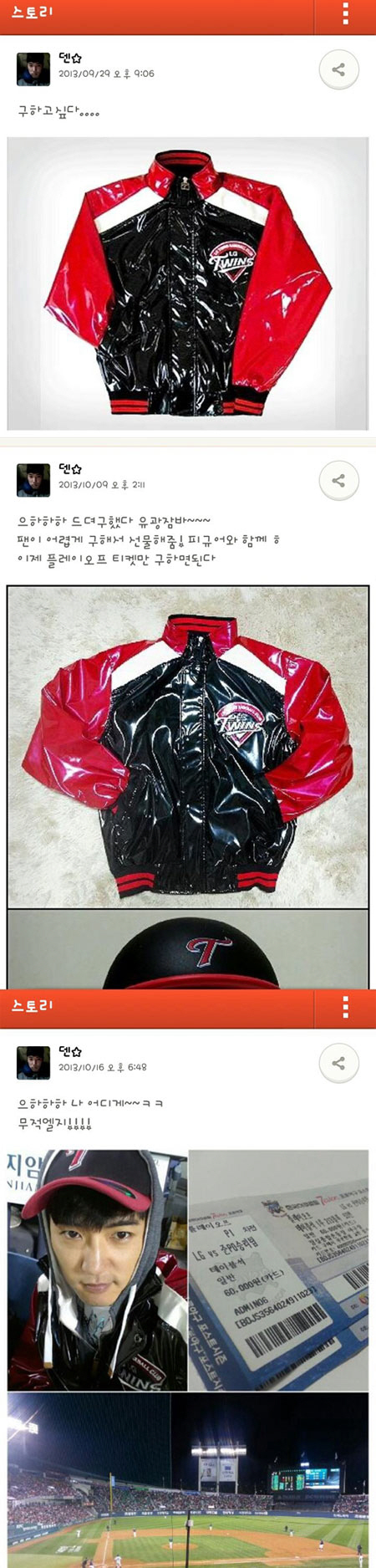 이후 10월 16일 카스에 "으하하하 나 어디게 무적 엘지!!!. 난 지금 완벽한 세팅이야"라며 테이블석 티켓과 유광점퍼와 모자를 쓴 완벽한 응원복장, 그리고 경기장을 직접 찍은 관전 인증샷을 여러장 공개했다.