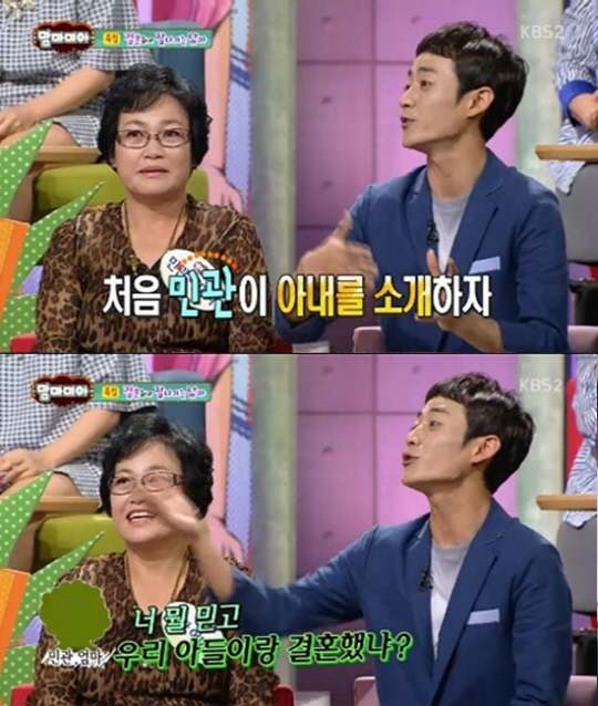 이날 한민관 어머니는 "며느리가 아들한테 콩깍지 씌었다"라고 언급했다. 그러자 한민관은 "아내를 소개할 때 엄마가 '너 따위가 이런 여자를?' 이란 표정을 지었다"고 설명해 주위를 폭소케 했다.