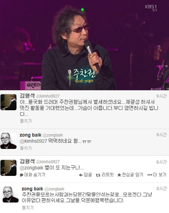 이날 김형석은 자신의 트위터에 "아. 들국화 드러머 주찬권형님께서 별세하셨네요. 재결성 하셔서 멋진 활동을 기대했었는데 가슴이 아픕니다. 부디 영면하시길 빕니다"라며 "별이 또 지는구나"고 고인의 사망 소식에 애도를 표했다.