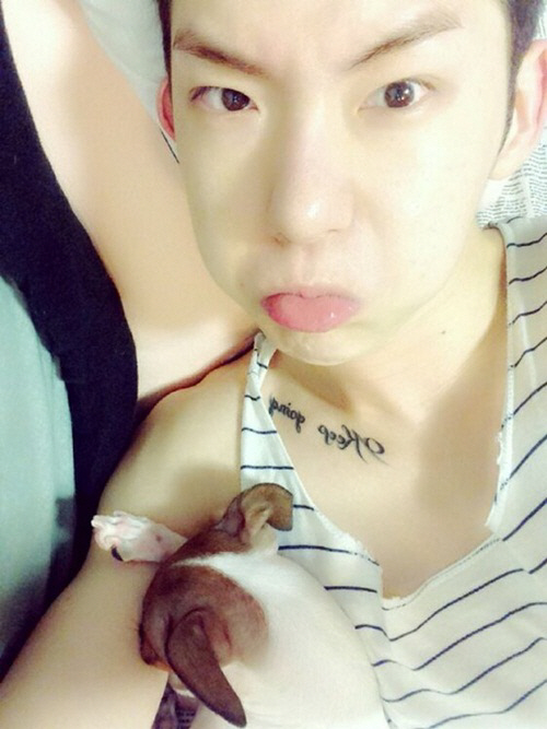 사진 속 조권은 자신의 애완견에게 어깨를 내어준 후 침대에 누워 셀카 촬영에 여념이 없는 모습이다. 이어 줄무늬 티셔츠를 입은 채 새하얀 피부를 뽐내고 있는 조권은 눈을 치켜 뜬 채 입술을 내미는 귀요미 표정을 짓고 있어 시선을 사로잡았다.