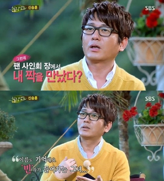 이날 '노총각' 신승훈은 6년 전 운명의 여인을 만났던 일화를 고백했다. "팬 사인회장에서 눈길이 가는 여성분이 있었다. 이름에 '빈'자가 들어가는 분이었는데 나도 모르게 전화번호를 달라고 말할 뻔 했다"는 그는 "용기를 냈어야 했는데 결국 물어보지 못했다"고 털어놨다.