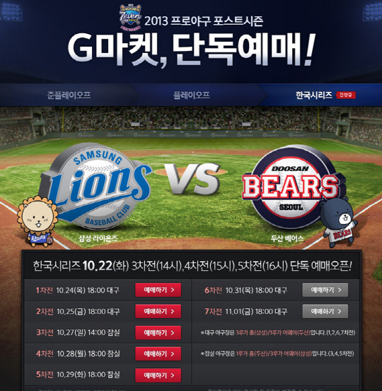 한국시리즈 3차전의 예매는 오후 2시, 4차전의 예매는 오후 3시, 5차전의 예매는 오후4시부터 한 시각 간격으로 진행된다.