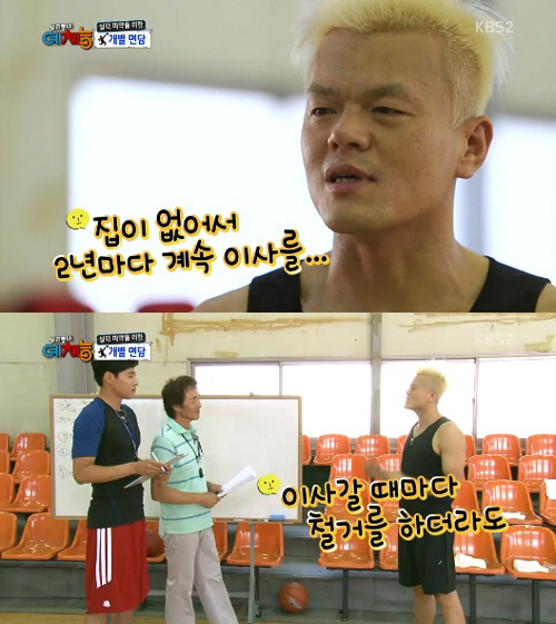 22일 방송된 KBS2 '우리동네 예체능'에서 박진영은 최인선 감독과 우지원 수석코치 앞에서 "음악 말고 한 가지 더 사랑하는 게 있는데 그게 바로 농구"라며 "중학교때부터 쭉 농구를 해서 경력은 20년 정도 된다. 지금까지 집이 없어 2년 마다 계속 이사 다니는데 이사갈 때마다 철거하더라도 항상 집에 농구대를 만들었다"고 밝혔다.