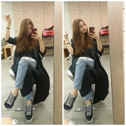 사진 속 수지는 미용실 의자에 앉아 거울에 비친 자신의 모습을 휴대전화로 촬영하고 있는 모습. 찢어진 청바지에 운동화를 신고 편안하면서도 스타일리시한 패션을 선보인 수지는 푸석푸석해진 머리에 뾰로통한 표정을 지어 보였다.
