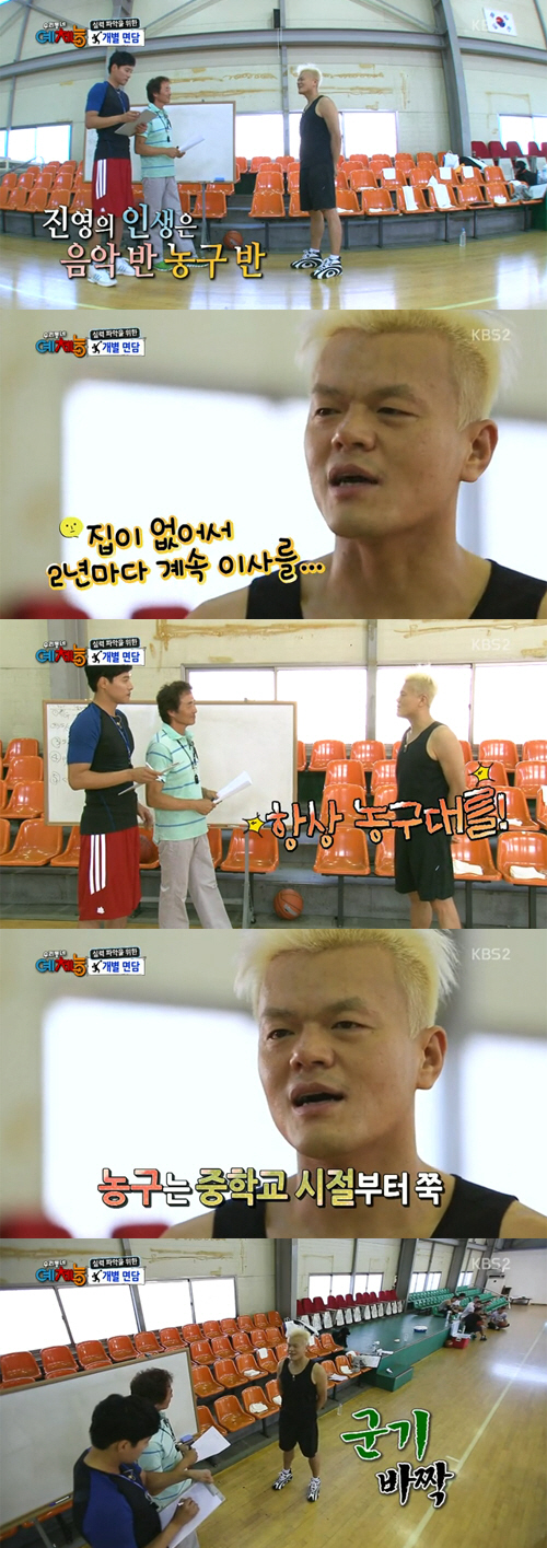 박진영은 "음악 말고 한 가지 더 사랑하는 게 있는데 그게 농구다"라며 "지금까지 집이 없어서 2년마다 계속 이사를 다닌다. 전셋집 이사 갈 때마다 농구대를 철거하더라도 항상 다시 만들었다. 그 정도로 농구를 사랑한다"고 밝혔다. 이어 "농구 경력은 중학교 시절부터 쭉 해서 20년 정도 됐다"고 덧붙였다.