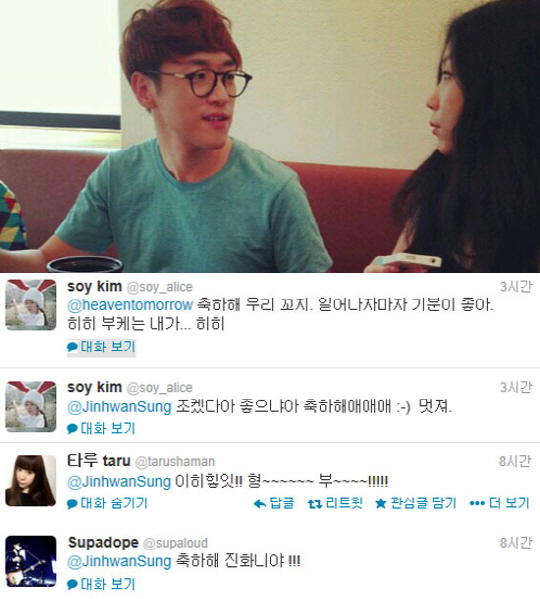 이외에도 데이브레이크 이원석, 랄라스윗 박별, 못 이이언, 디어클라우드 나인 이랑, 보드카레인 주윤하 등 수많은 가수 동료들이 성진환, 오지은 커플 트위터에 답글을 남기며 결혼을 진심으로 축하했다.