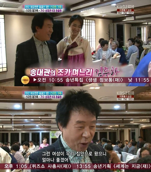 또 그날 방송에서 송대관은 "큰 대어를 낚은 기분이다. 우리나라 최고의 아나운서고 이렇게 예쁜 여성이 우리 집안에 들어왔는지 모르겠다. 우리 조카가 복이 넘쳤다"고 칭찬했다.