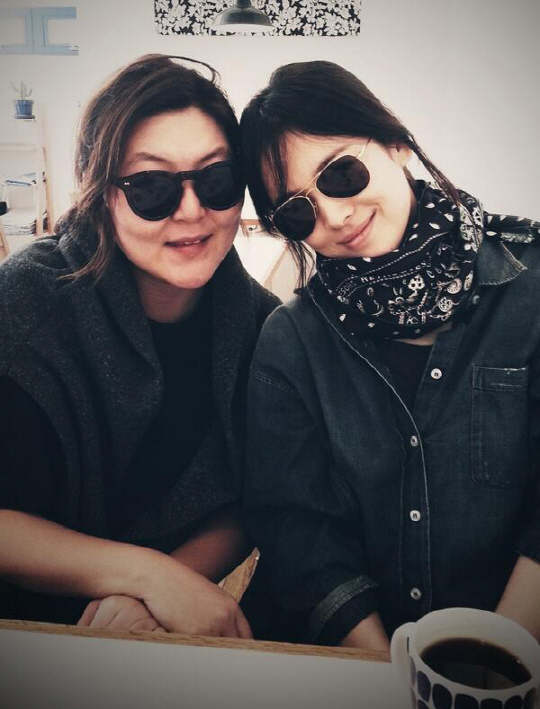 사진에서 송혜교는 보잉 선글라스에 청남방, 목에는 스카프를 두른 편안한 차림을 선보였다. 자연스러운 스타일을 선보인 송혜교는 미소를 지으며 한혜연에게 기대는 애교 있는 포즈를 취해 눈길을 끈다.