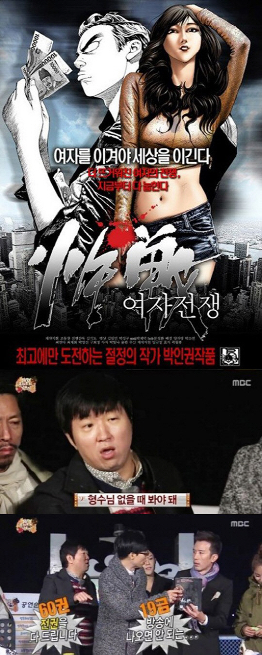 '여자전쟁'은 지난 19일 방송된 '무한도전-자유로 가요제' 선상파티 편에서 정형돈의 애장품으로 공개됐다. 정형돈은 애장품 추첨에 당첨된 박명수에게 "만화책은 형수님 없을 때 봐야한다. 읽으면 둘째가 생긴다"고 말해 궁금증을 자아냈다. <스포츠조선닷컴>