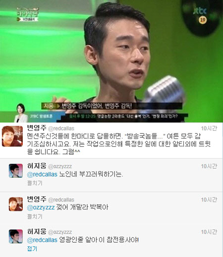 그러자 변영주 감독은 "꺼져. 개말라 박복아"라는 글을 게재했고, 허지웅은 "영광인줄 알아 이 참전용사야"라고 남기며 트위터 설전을 펼쳐 보는 이들을 폭소케 했다.