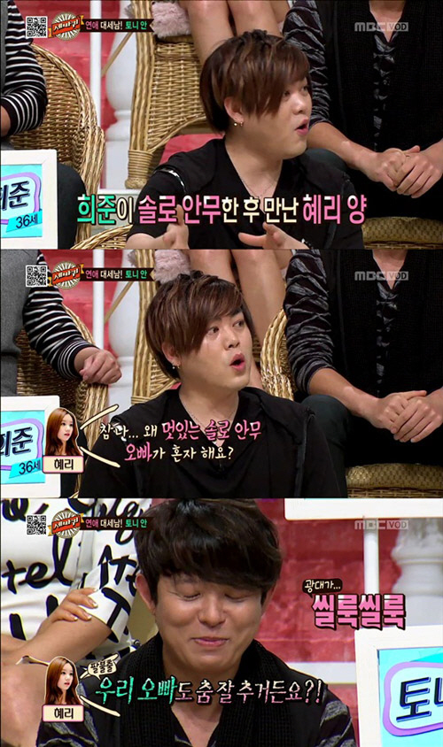 문희준은 "토니에게 진짜 부러운 것이 하나 있다"라며 "한 프로그램에서 핫젝갓알지로 함께 무대에 섰다. 중간에 안무 중에 내 솔로 안무가 있었다. 그 후 다른 방송에서 혜리를 만났다"라고 당시를 회상했다.