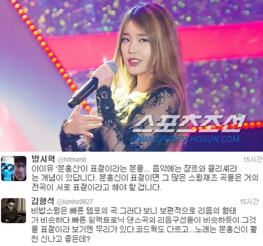 26일 방시혁은 자신의 트위터에 "아이유 '분홍신'이 표절이라는 분들. 음악에는 장르와 클리셰라는 개념이 있답니다. '분홍신'이 표절이면 그 많은 스윙재즈 곡들은 거의 전곡이 서로 표절이라고 해야 할 겁니다"라고 의견을 표했다.