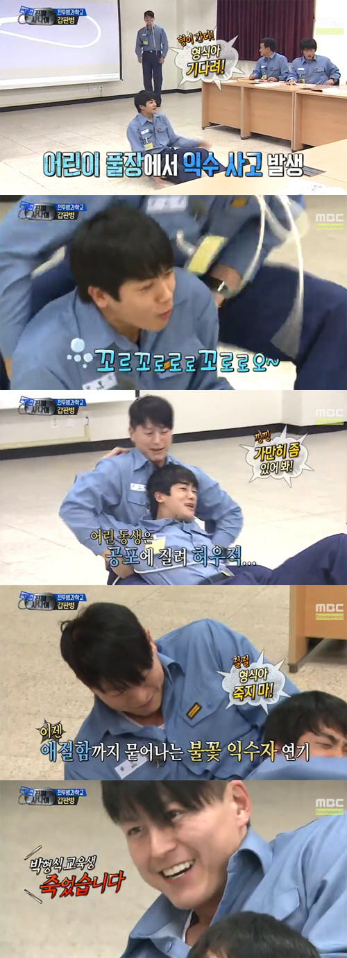 이날 멤버들은 올가미 구조 교육을 받았고, 박형식은 류수영과 짝을 이뤘다. 익수자 역을 맡은 박형식은 실제 물에 빠진 듯 실감 나는 연기를 선보였다.