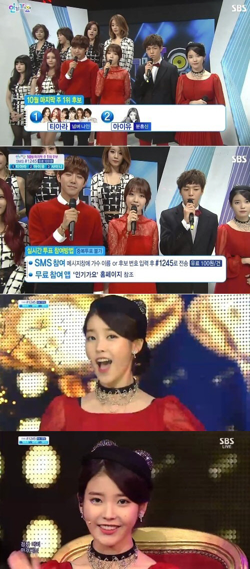 또한 이날 '인기가요' 10월 마지막 주 1위 후보에 오른 아이유는 방송 초반 모습을 드러내 '분홍신'을 짧게 소개했고, 이후 10위부터 4위까지 순위를 전하기 위해 이현우와 함께 스페셜 MC를 진행하기도 했다.