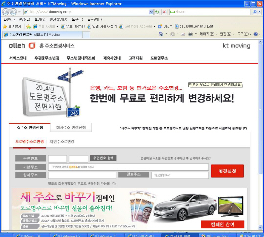 안전행정부와 KT가 주관하여 진행하는 '도로명 주소 전환 캠페인'에서 KT무빙 주소이전 서비스(www.ktmoving.com)를 이용하는 고객들은 올해 11월30일까지 주소이전 서비스를 이용할 경우 K5 자동차와 125cm LED 텔레비전(5대)과 온누리상품권 3~5만원권 800명 등 푸짐한 경품도 제공하고 있다.