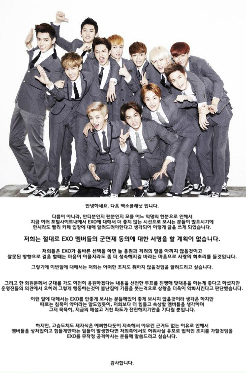 이어 "저희는 절대로 엑소 멤버들의 군 면제 동의에 대한 서명을 할 계획이 없습니다"며 군면제 서명운동 논란과 관련해 해명했다.