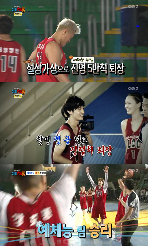 그 결과 박진영이 5반칙 퇴장을 당했고, 최강창민은 일주일 내내 연습한 자유투 득점에 성공했지만 바로 퇴장당해 아쉬움을 샀다. 예체능 농구단은 순식간에 3점 차까지 따라잡혔다.